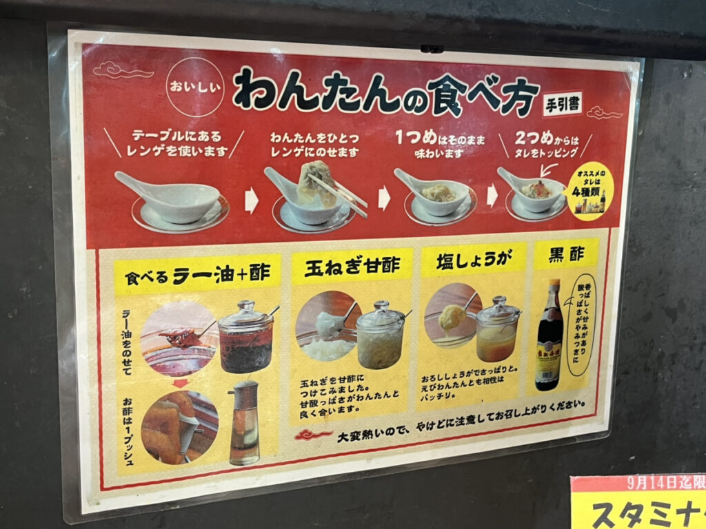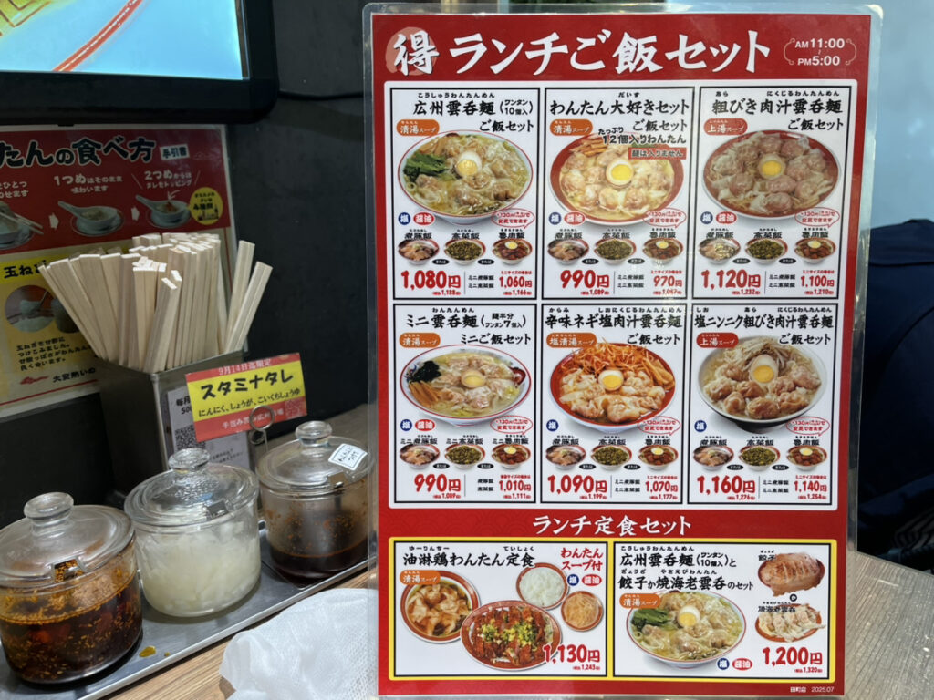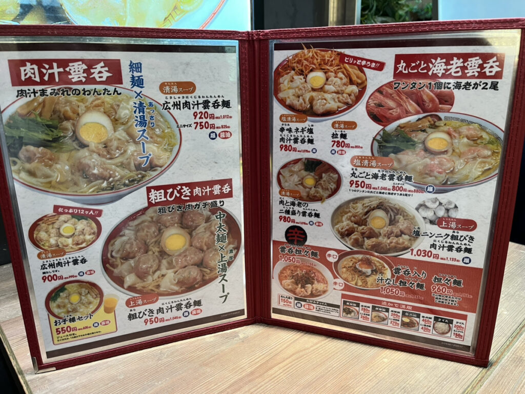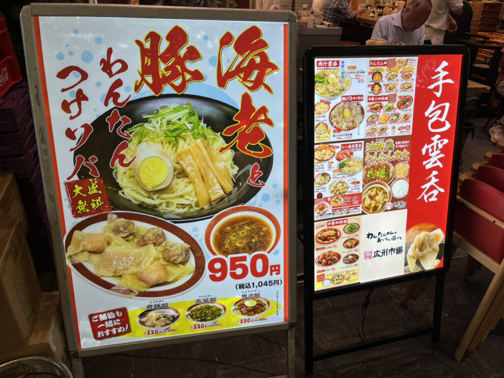 看板メニューのひとつ「広州肉汁雲呑麺」。