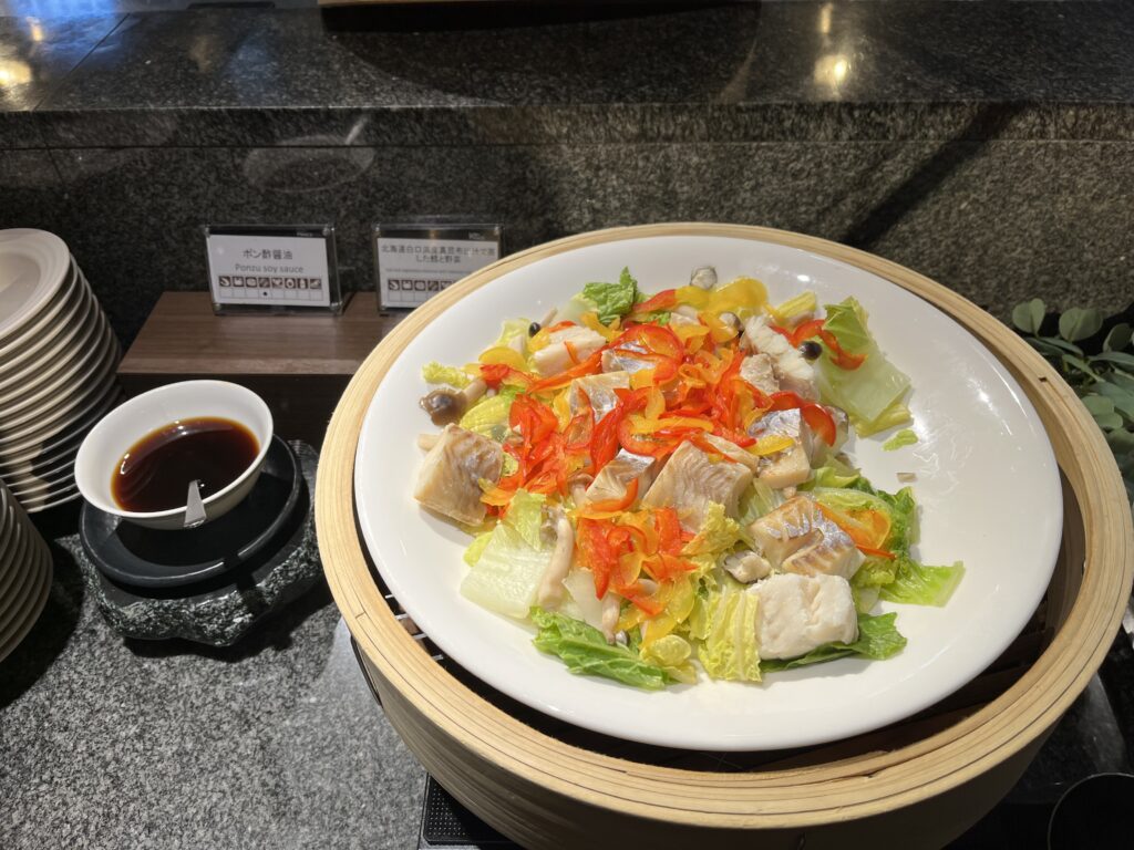 北海道白口浜産真昆布出汁で蒸した鱈と野菜