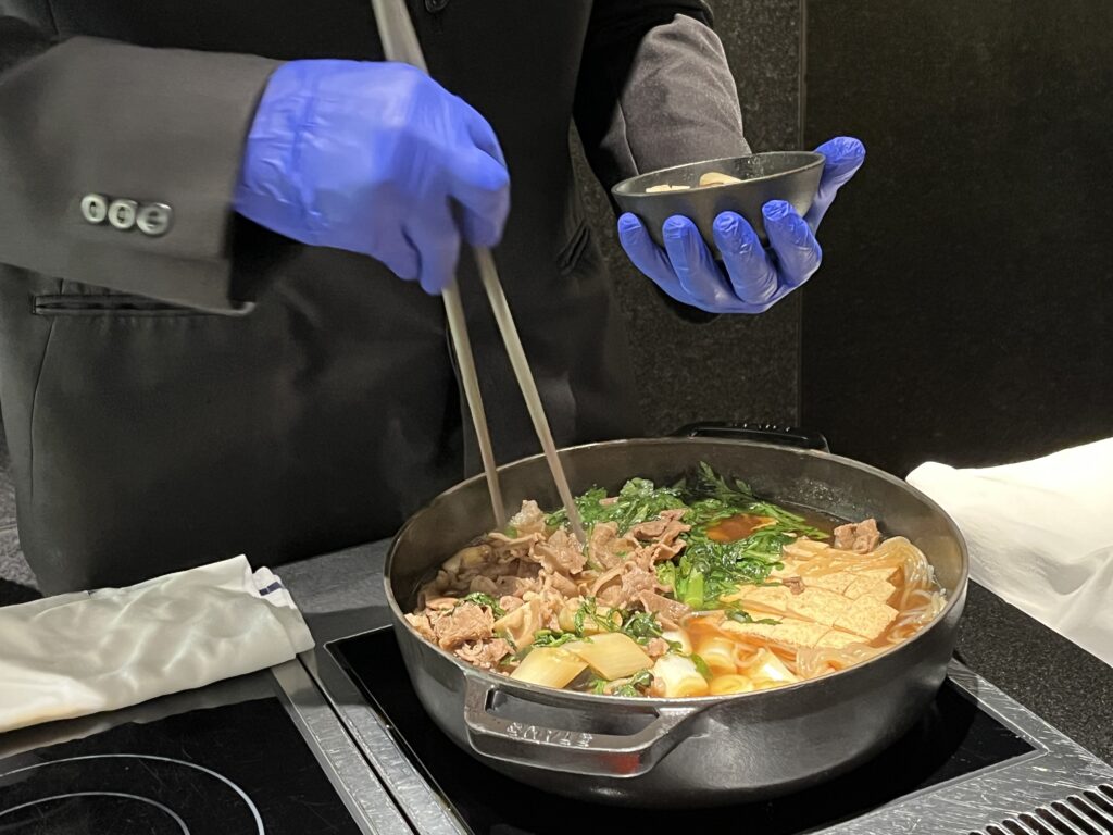 シェフが熱々のすき焼きをよそってくださり、