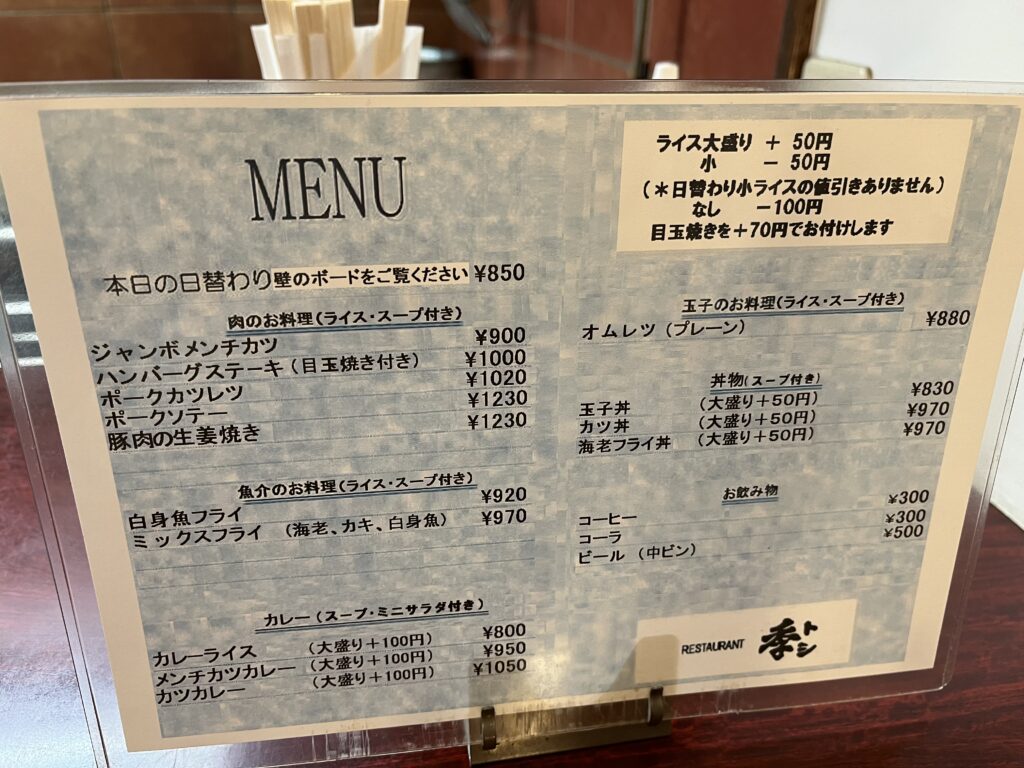 今回のお目当ては、事前に決めていた看板メニュー「ジャンボメンチカツ(900円)」。日替わりメニューは「チキンカツ」で、ほとんどの方がこのどちらかを注文していました。
